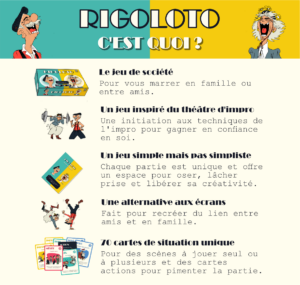 RIGOLOTO, c’est un jeu de société, un jeu d’improvisation pensé pour les familles, les adolescents, et tous ceux qui souhaitent passer un bon moment !